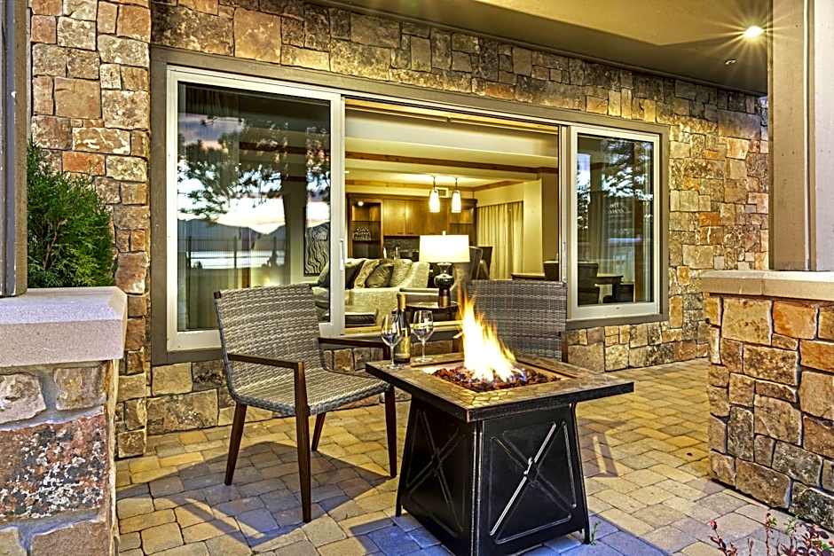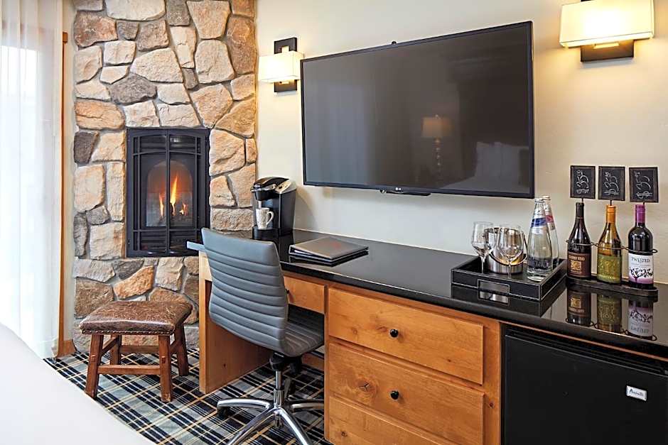 Featuring a private patio, this room offers a stone gas fireplace, a 55-inch flat screen TV with cable channels, a Keurig coffee machine, a refrigerator, a smartphone-compatible alarm clock, and an private bathroom with heated marble floors and heated toilet seat, a walk-in rain shower, luxury toiletries and a plush robe with slippers.